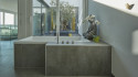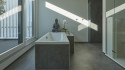 Die Kinderzimmer mit Bezug zum Garten, ein Arbeitszimmer, die Nebenräume und die Doppelgarage sind dabei im Erdgeschoss verortet. Über eine einläufige Stahltreppe werden beide Ebenen verbunden.